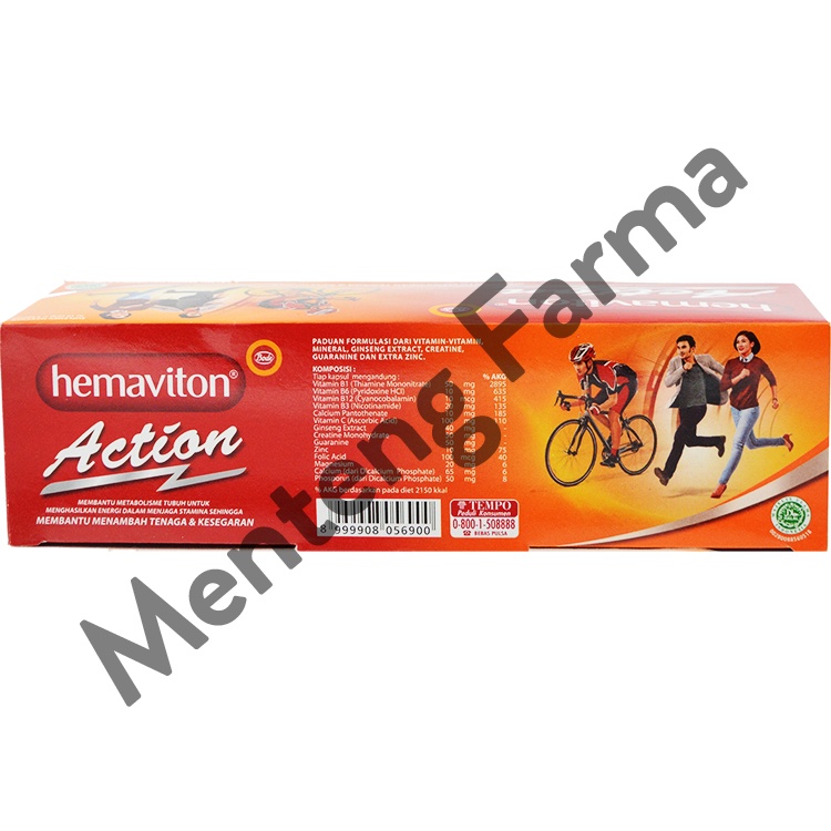 Hemaviton Action adalah suplemen makanan untuk pria dan wanita dengan Multivitamin lengkap, Mineral, Ginseng Extract, Creatine, Guaranine dan Extra Zinc yang dapat membantu metabolisme tubuh untuk menghasilkan energi dalam menjaga stamina sehingga membantu menambah tenaga dan kesegaran.