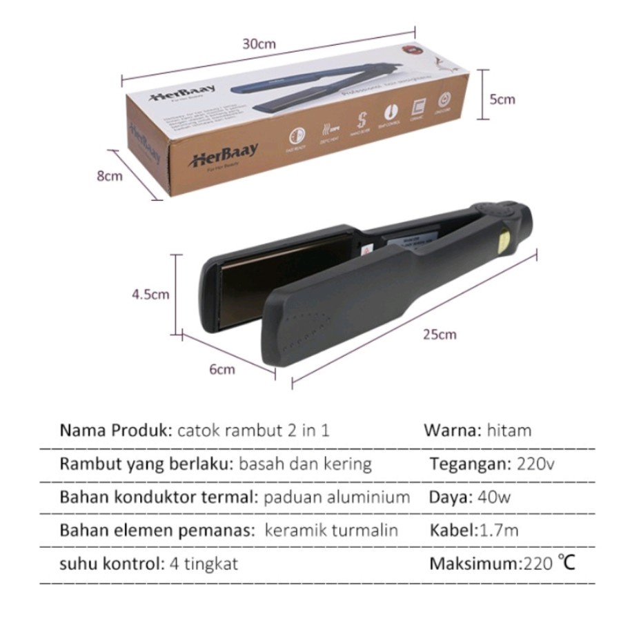 Deskripsi Produk: Rentang suhu 1,160 - 220 : keramik turmalin yang dipanaskan secara merata untuk mencegah kerusakan rambut 2. Cepat Panas: 15 detik 3. Suhu Stabil : Pengaturan suhu yang cerdas 160/180/200/220, rambut lebih terawat pada suhu konstan, dapat di atur 4. Bagian Ujung tidak panas, tidak memukai tangan anda 5. Bisa untuk mengeritingkan & meluruskan rambut, mudah menghasilkan gaya rambut yang stylish 6. Tebal 4.5cm pelat pemanas dengan panjang 10cm untuk meluruskan rambut lebih baik Jauhkan rambut dari kerusakan, cukup pilih Herbaay, dan dapatkan tataan rambut Anda yang natural, nyaman dan indah.