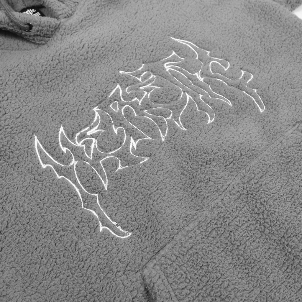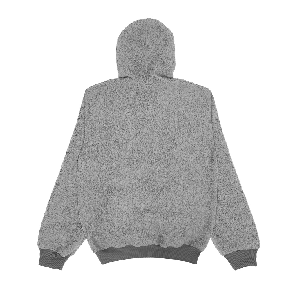 Grey pullover hoodie sherpa fleece with embroidery logo at front.