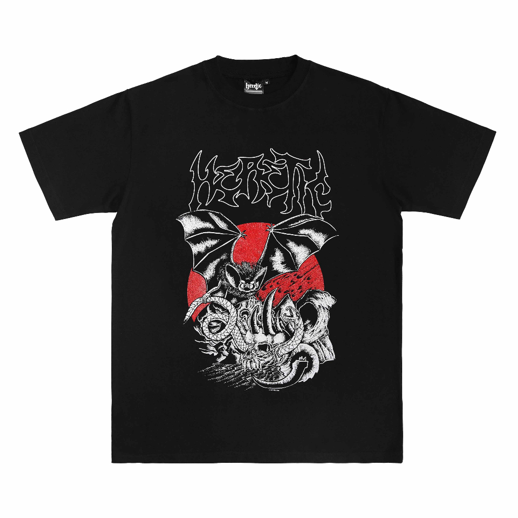 Black cotton combat 30s tees with plastisol ink and woven patch.