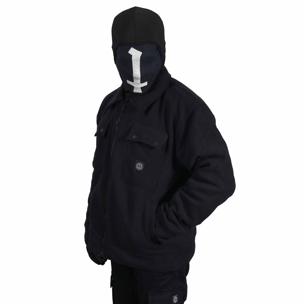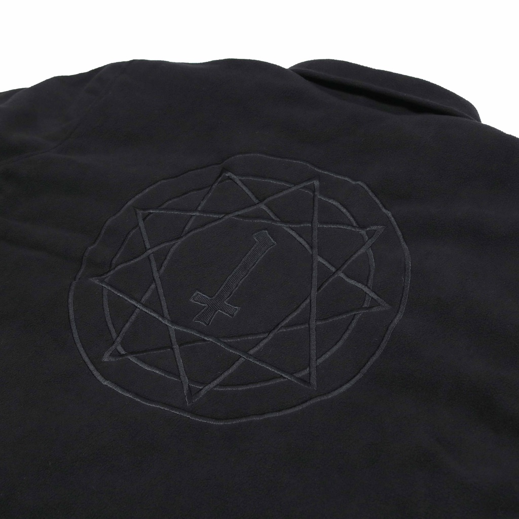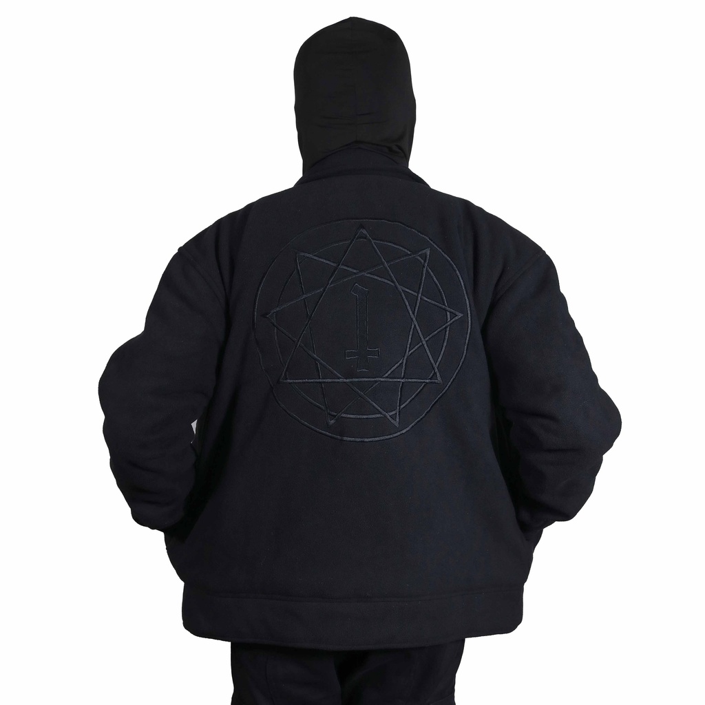 Black polar work jacket with 4 pocket at front and 1 woven path, also black on black pentagram logo embroidery at back.