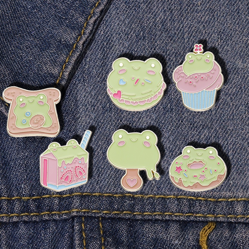 Detail Hewan Lucu Kodok Enamel Pin Lencana Aksesoris Hadiah Untuk Teman Makanan Styling Lapel Kartun Kue Donat Es Krim Logam Bros