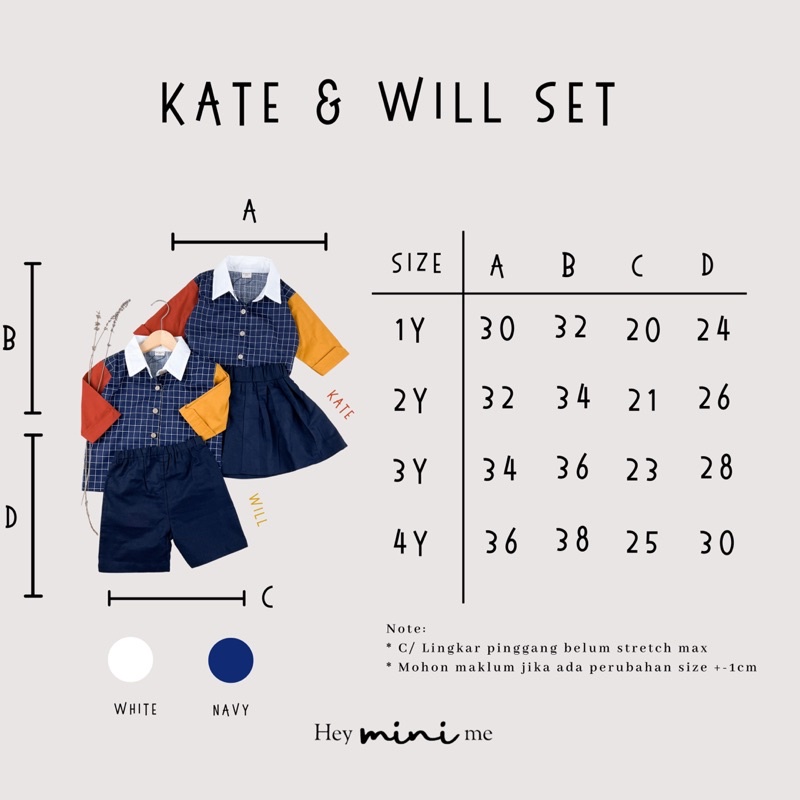 Ada 2 warna (navy & white) Bisa buat couple-an 1-4 th Material: Cotton & linen rami Size: 1Y | 2Y | 3Y | 4Y Type: Kate (for girl) & Will (for boy)