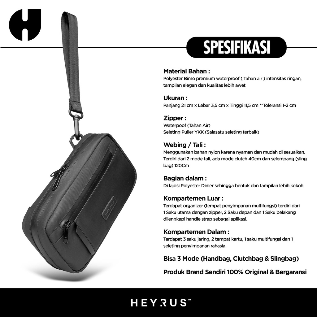* Material Bahan : Polyester Bimo Premium (Water Resistant) Intensitas sedang, tampilan elegan dan material bahan yang awet. * Ukuran :Panjang 21 cm x Lebar 3,5 cm x Tinggi 11,5 cm **Toleransi 1Cm * Seleting Waterpoof (Tahan Air) * Seleting Puller YKK (Salasatu seleting terbaik) * Webing belakang mengunakan bahan nylon dengan sablon HEYRUS * Tali Pendek menggunakan bahan nylon karena nyaman dan mudah di sesuaikan * Webing / Tali terdiri dari 2 mode ada mode clutch 25cm dan selempang (sling bag) 120Cm * Bagian luar terdapat organizer (saku multifungsi) terdiri dari 1 saku utama dengan zipper, 2 saku depan dan 1 saku belakang * Kompartemen dalam terdapat 3 saku jaring, 2 tempat kartu, 1 saku multifungsi dan 1 resleting penyimpanan tahasia. * Produk 1 termasuk tas multifungsi karena bisa di pakai jadi 3 mode yaitu : clutch , handbag dan sling bag