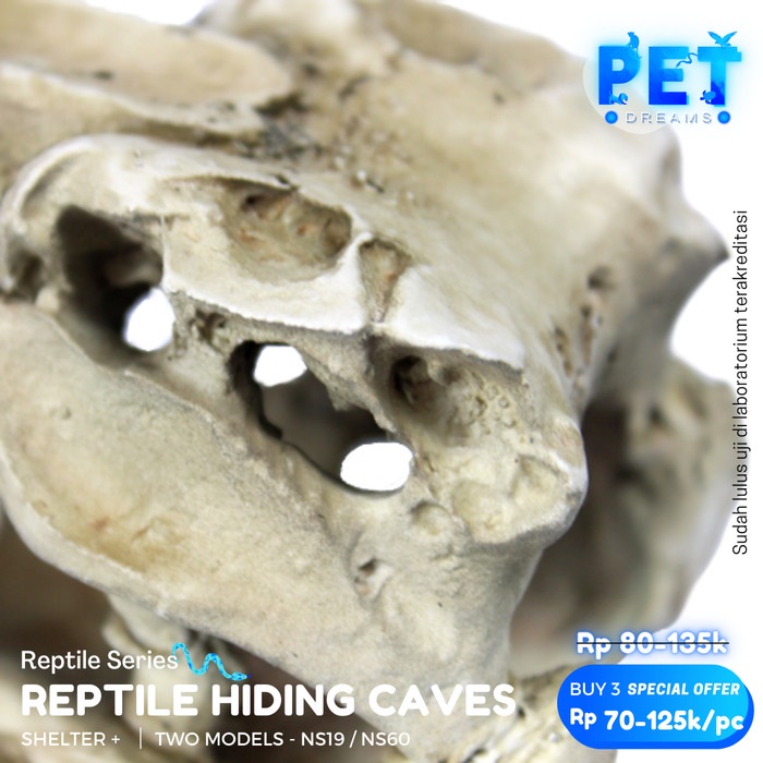 INFORMASI TAMBAHAN : Iklim mikro yang lembab di dalam Hiding Cave akan mendukung termo-regulasi dan hidrasi, serta membantu proses pelepasan reptil secara alami. Dibentuk sangat realistis dan menambahkan aksen prasejarah ke semua jenis terarium; gurun, hutan hujan atau perairan