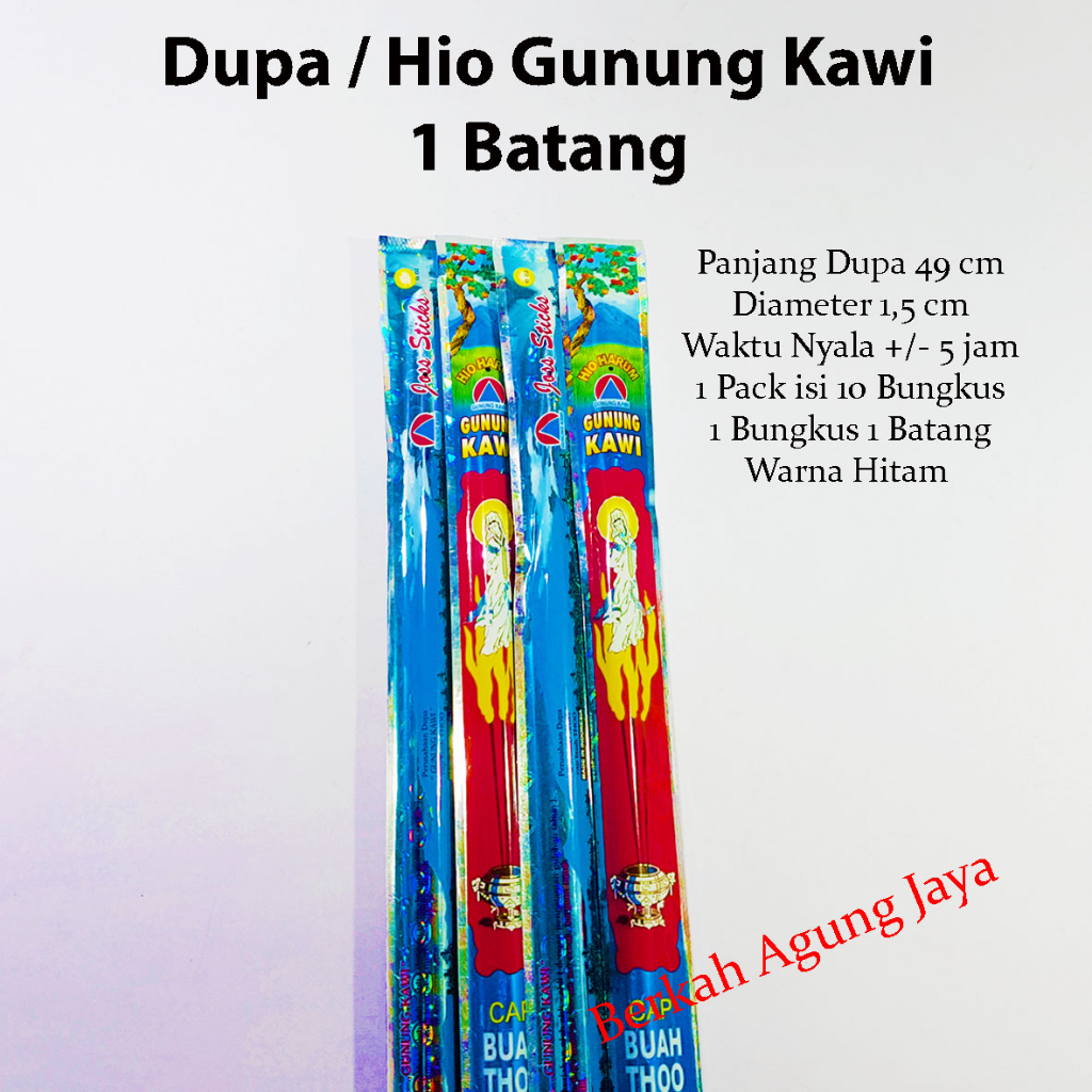 Hio Wangi Gunung Kawi Dupa cap Buah Thoo isi 1 batang / pack : -.) Stick panjang dupa 49 cm. -.) 1 pack isi 5 bungkus. -.) 1 Bungkus isi 1 batang. -.) Berwarna hitam.