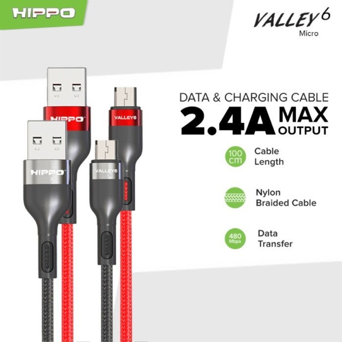 Handphone & Aksesoris > Kabel, Charger, & Konverter > Kabel & Adaptor Handphone > Hippo Kabel Data Valley 6 Braided USB to Micro 2.4 A Quick Charge 3.0 Fast Charging Android Data Cable