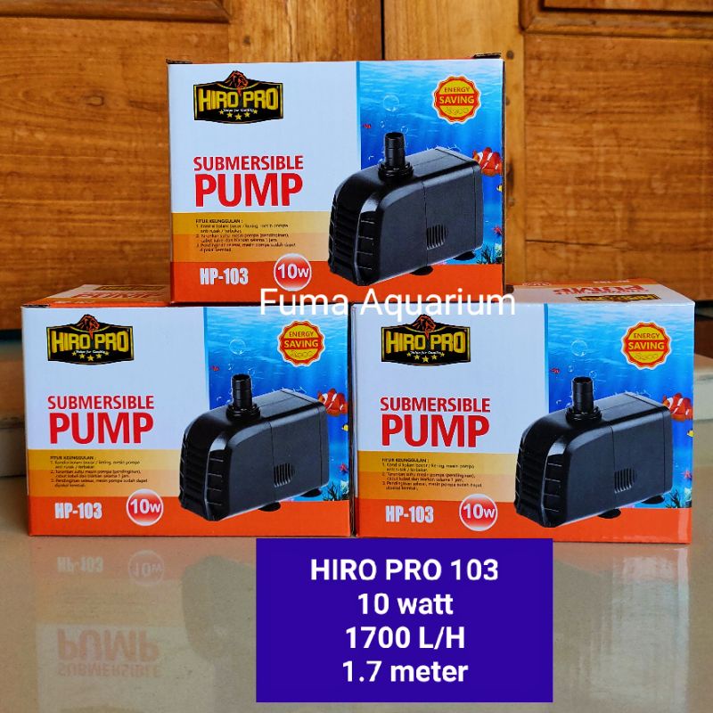 Merk: HIRO PRO Model: HP - 103 Volt: 220-240V Freq: 50/60Hz Power: 10watt Max jet: 1.7m Output: 1700 L/H Hemat Energi,tenaga power full dan stabil, tidak bising, dapat Digunakan 24 jam Non-stop, harus terendam air dapat di gunakan untuk air tawar dan laut