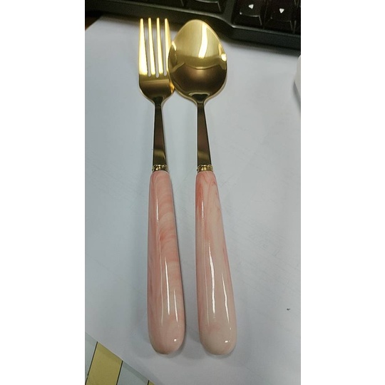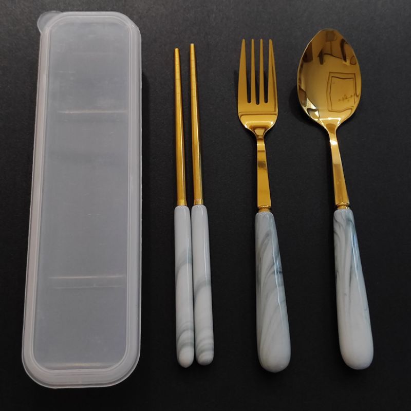Perlengkapan Rumah > Peralatan Makan > Alat Makan > # HJ # Set Sendok Garpu Sumpit Keramik / Set Alat Makan Travel Gold Marble Keramik / Set Alat Makan Korea