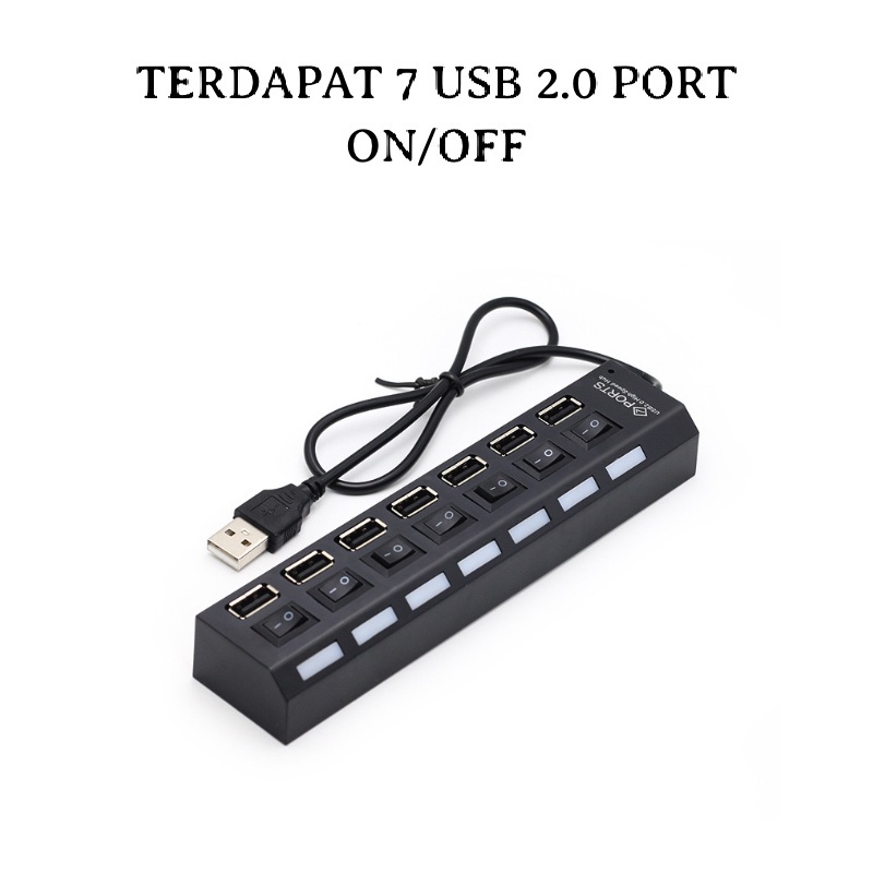 USB HUB 7 PORT DENGAN TOMBOL ON / OFF PADA MASING2 NYA. DENGAN LED BERWARNA BIRU SBG INDIKASI POWER CABLE LENGTH : +/- 70 CM COLOR : HITAM / PUTIH NETT WEIGHT : 90 GRAM PLUG AND PLAY