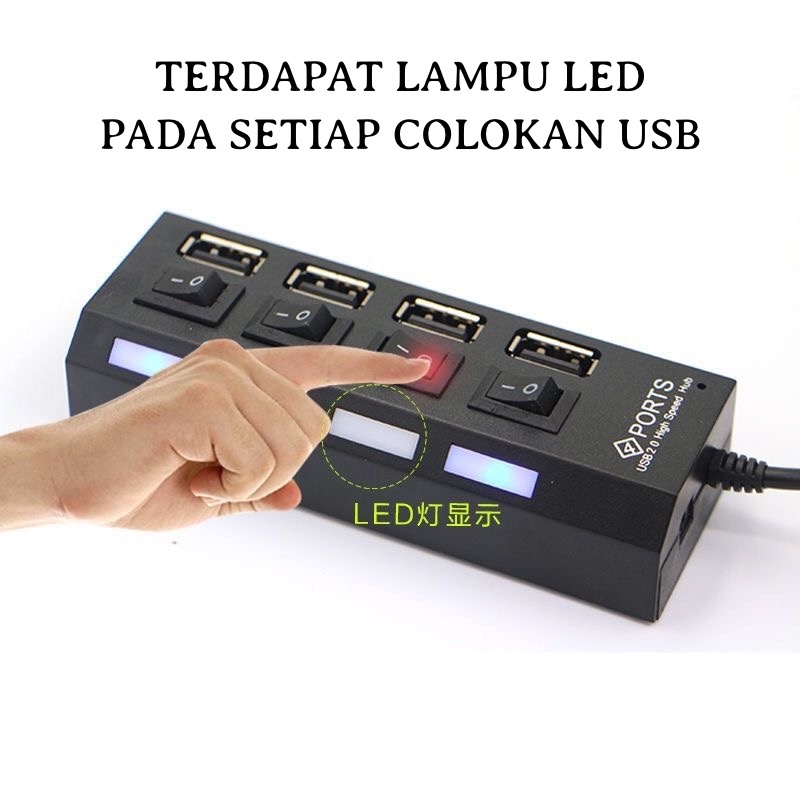 4 USB HUB DENGAN TOMBOL ON / OFF PADA MASING2 NYA. DENGAN LED BERWARNA BIRU SBG INDIKASI POWER CABLE LENGTH : +/- 70 CM COLOR : HITAM / PUTIH (DIKIRIM RANDOM = TIDAK BISA PILIH WARNA) PLUG AND PLAY