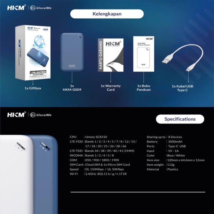 Detail HKM G009 Modem Mifi GlocalMe Worldwide Portable wifi Free Kuota Resmi
