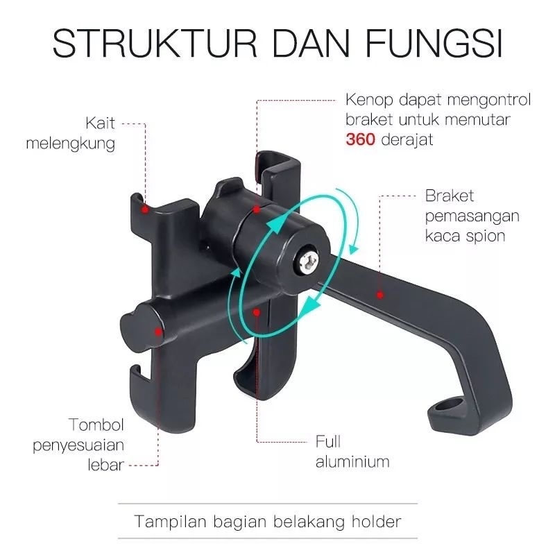 Spesifikasi : - Type : Holder Motor spion - textures : alloy - feature : Donโt Block cameras and all kinds of buttons to throw off, can rotate 360ยฐ - Aoolication : suiable for all kinds bicycles, motorcycles, scooters - Advantage : Durable, resistance to blok, lock
