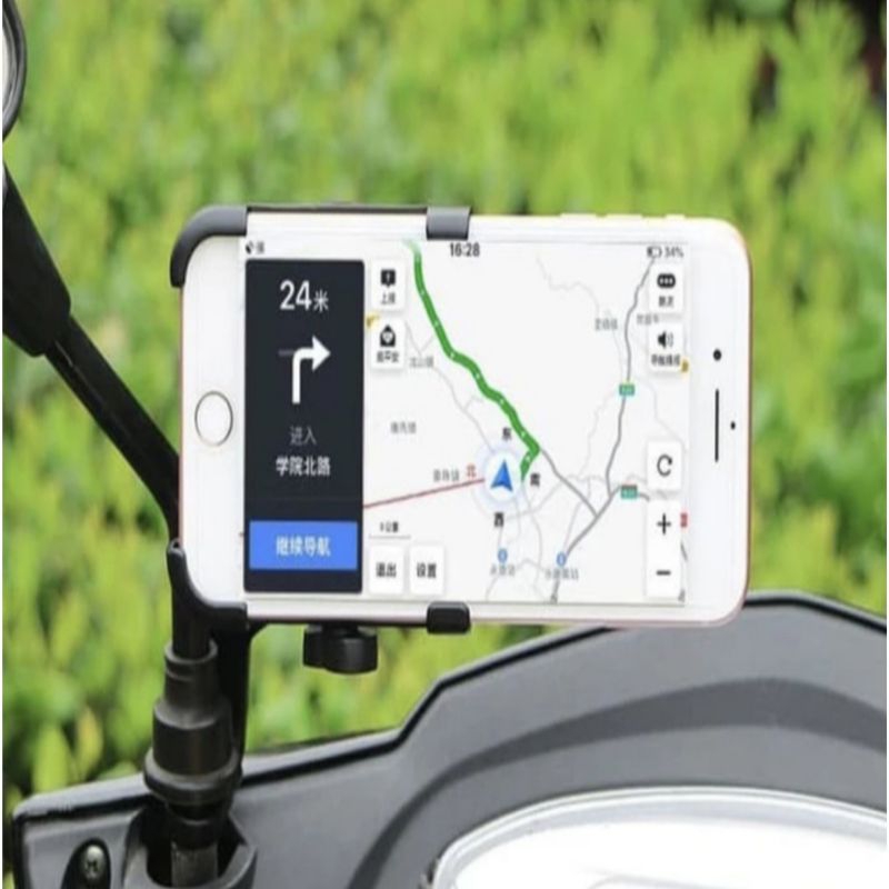 Dimensi: Cocok untuk smartphone dengan lebar bodi 60-100mm dan ketebalan HP max. 10mm. Material: Full Metal Alumunium Holder ini dipasang pada bagian SPION motor.