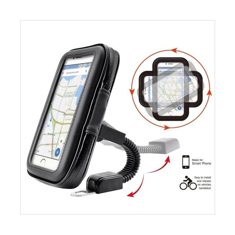 Stand Holder Motorcycle waterproof case for Smartphone merupakan dudukan smartphone atau GPS, berfungsi untuk menopang Gadget yang digunakan untuk melihat peta atau arah yang dituju. Stand holder ini sangat nyaman digunakan baik dalam cuaca panas maupun hujan, Cocok untuk pengendara sepede motor, terutama Ojek (Gojek, Grab bike etc.) untuk touring perjalanan jarak dekat maupun Jauh. Stand Holder Motorcycle Waterproof case for Smartphone terbuat dari baja dikombinasikan dengan kulit. Ini yang membuat holder tersebut terkesan berkelas dan elegan. Dan kemampuannya holder ini tahan terhadap air. Oleh karena perangkat ini anti air, jadi pengguna tidak usah merasa takut smartphone nya terkena air terutama air hujan.