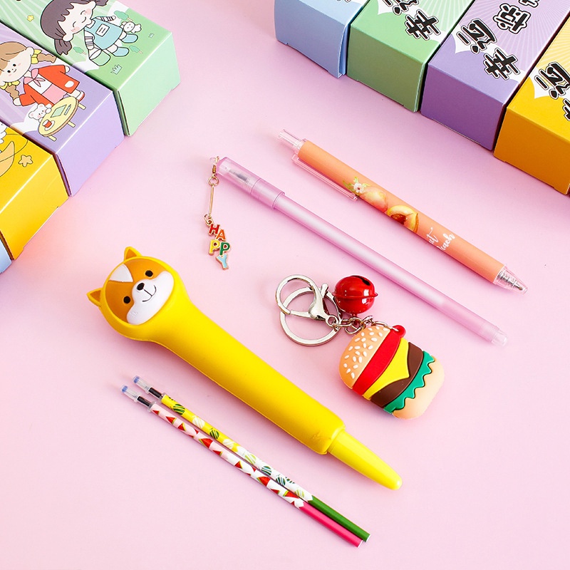 Nama Produk: Set Pen Gel Alat Tulis Kartun Lucu dengan Gantungan Kunci Warna Warni Kado Hadiah Warna: Pink , Biru , Ungu Ukuran: 12.0x4.0x4.0cm Berat: 70g Material: Plastik