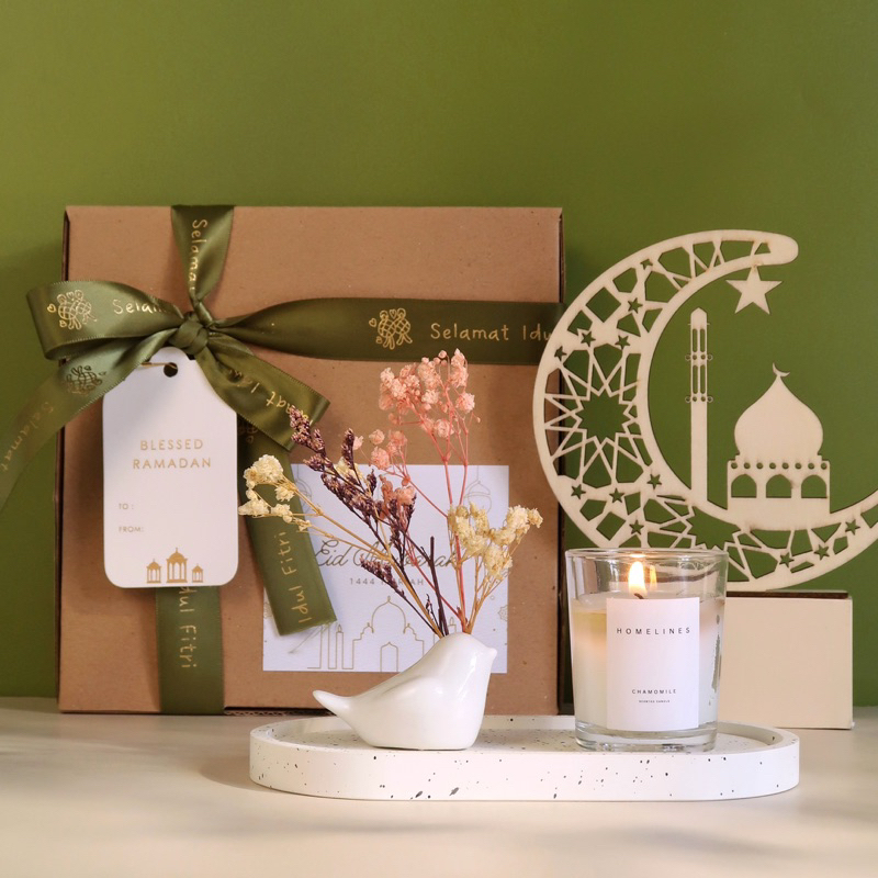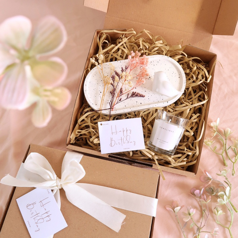 Dalam 1 hampers sudah dapat : - 1 pcs Tray Oval - 1 pcs Candle Glass Lavender/Reed Diffuser (Lavender) - 1 pcs Vase Bird + Flower - Include box, pita, tag