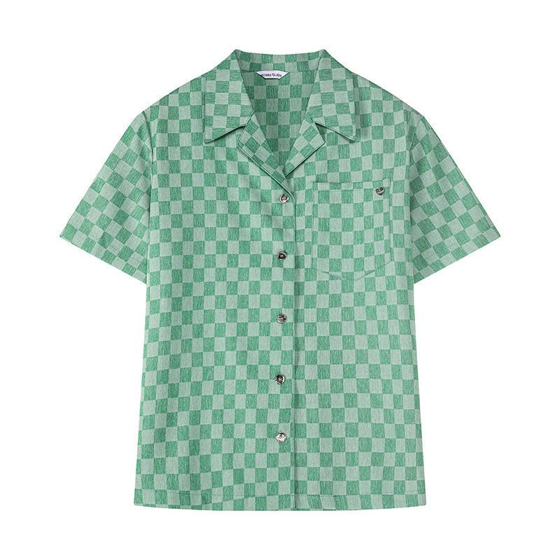 Hong Kong Papan Catur Kotak-kotak Kemeja Musim Panas Wanita Lengan Pendek Kemeja High-End Longgar Ko