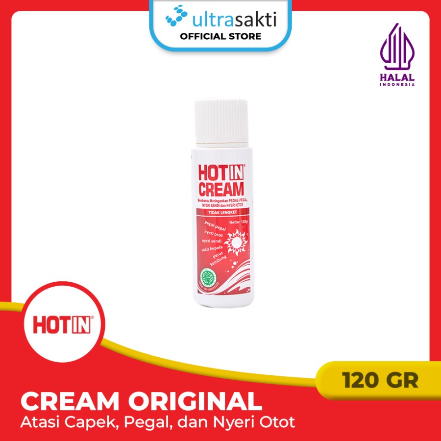 Deskripsi Hot In Cream - 120 mL/ 60ml Pereda Nyeri Otot dan Pegal-pegalHot In Cream adalah analgesik (obat penghilang rasa nyeri) cream yang berguna untuk mengatasi capek, pegal-pegal dan nyeri otot yang mengganggu aktivitas harian. Merupakan sediaan krim dengan panas yang pas, mudah meresap, dan tidak lengket di kulit, serta tidak meninggalkan bekas putih dikulit. Hot In Cream juga tidak membekas pada baju atau sprey saat dipakai ingin tidur.ManfaatMelemaskan ototMeringankan berbagai macam gangguan seperti, pegal-pegal, nyeri sendi, nyeri otot, pegal linu, masuk angin, perut kembung, flu, sakit kepala, kesemutanMenstabilkan daya tahan tulang dan ototPemakaianGunakan Hot In pada bagian yang pegal atau sakit. Gunakan secukupnyaHot In tidak untuk digunakan oleh anak umur dibawah 2 tahun. Jangan gunakan Hot In langsung dibawah hidungKandunganEkalitus oil, Piine oil, Sereh oil, Menthol Kristal 6%, Gandapura oil 3,5%.