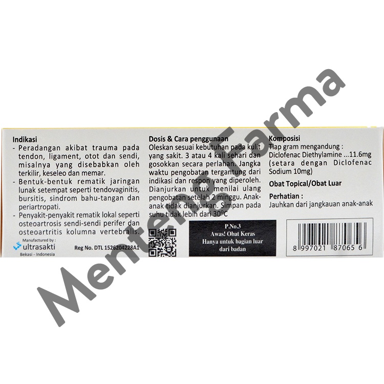 Zat Aktif yang terkandung : Diclofenac merupakan golongan obat antiinflamasi nonsteroid NSAID). Berdasarkan proses kerja obat dalam tubuh, diclofenac diketahui memiliki status: - Absorpsi: Diserap dalam kulit. Waktu yang dibutuhkan untuk mencapai kadar tertinggi dalam plasma (waktu puncak konsentrasi plasma) sekitar 1 jam. - Distribusi: Melewati plasenta dan masuk ke dalam ASI - Metabolisme: Dimetabolisme melalui hati. - Ekskresi: Dikeluarkan melalui feses dan urine.