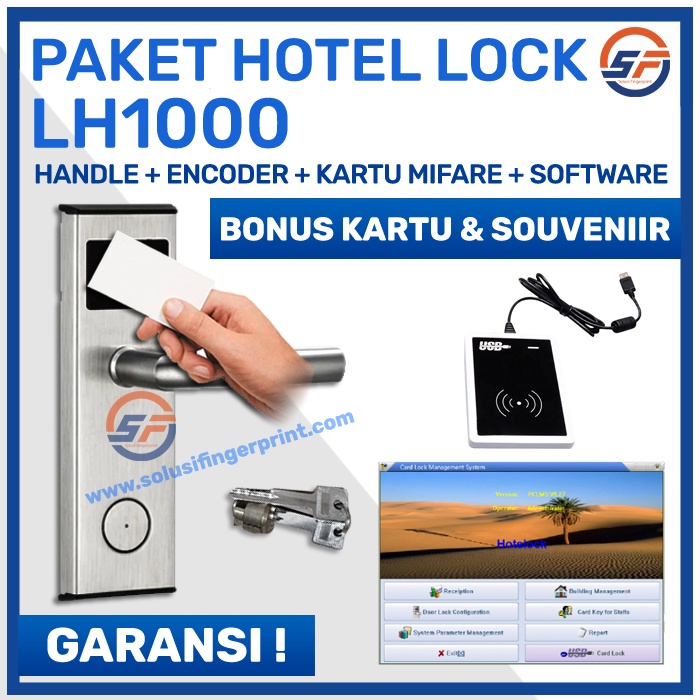 Keunggulan : • Cocok untuk Hotel, Kost, Apartemen. • Bisa cek transaksi yang buka kunci pintu. • Bisa atur waktu penggunaan kartu • Software Hotel Management V9, mudah digunakan dan tersedia banyak tutorial di youtube • Bahan Anti Karat, Elegan dan kokoh. • Bisa digunakan untuk pintu dengan ketebalan dari 35mm hingga 55mm. • Perangkat lunak multi-bahasa. • Tanpa Listrik menggunakan Battery 4 pcs AA • Tersedia Kunci manual