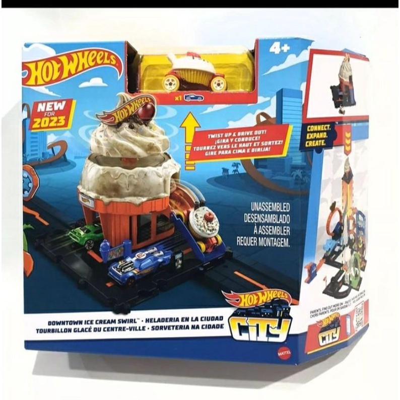 With the Hot Wheels City Downtown Ice Cream Swirl playset, kids drive tasty adventures with lots of track play and storytelling possibilities. Drive past the sign diverter and into the cone, then spin the Hot Wheels logo to move the included Hot Wheels car through the swirl and down the drop-down ramp to more adventures. The playset has multiple connection points so that kids can connect it to other Hot Wheels sets and build a unique world of Hot Wheels adventures. The Hot Wheels City Downtown Ice Cream Swirl set includes a 1:64 scale Hot Wheels car for complete play right out of the box. Makes a great gift for kids 4 years old and older.