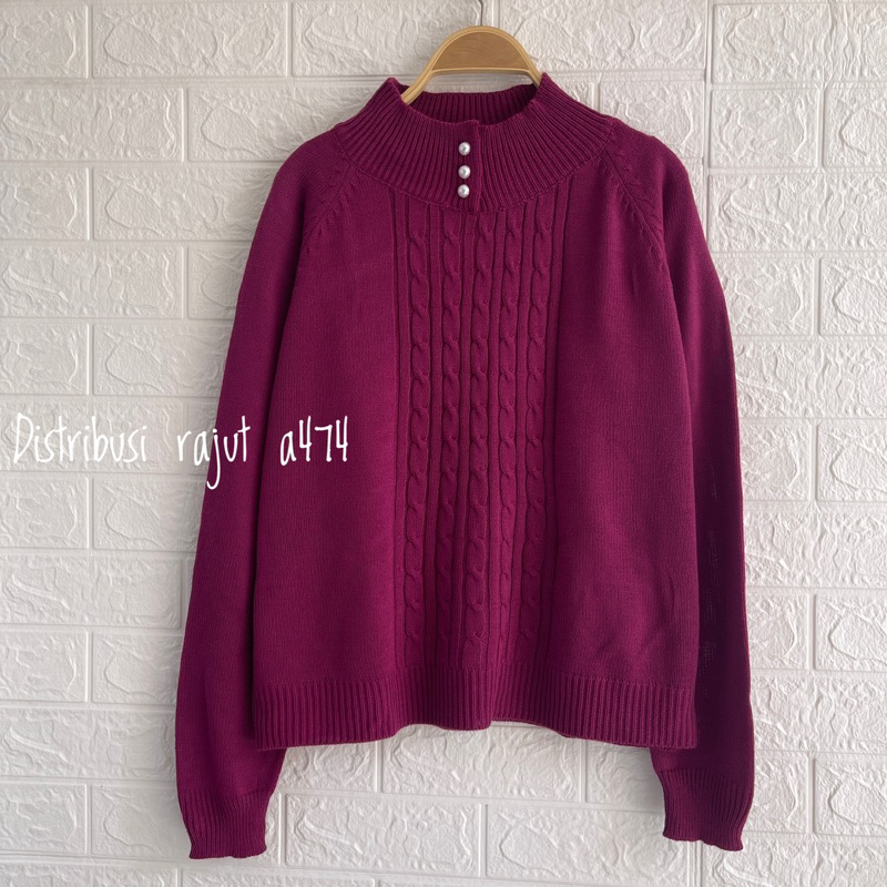 Detail HOZURA SWEATER RAJUT KANCING MUTIARA MOTIF CABLE KERAH TINGGI WANITA OVERSIZE