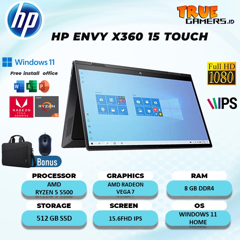 Spesifikasi : - Prosesor AMD Ryzen™ 5 5500U (2.3 GHz base clock, up to 4.0 GHz max boost clock, 3 MB L2 cache, 6 cores) - OS Windows 10 Home - RAM 8GB DDR4 dual chanel - Storage 256GB PCIe® NVMe™ M.2 SSD - Display 15.6" diagonal FHD, IPS, micro-edge, WLED-backlit, 250 nits, 45% NTSC (1920 x 1080) - VGA AMD Radeon™ Graphics vega 7 - Conection Intel® Wi-Fi 6 AX 200 (2x2) and Bluetooth® 5 Combo (Supporting Gigabit file transfer speeds)- - Ports : 1 USB 3.2 Gen 2 Type-C™ (10 Gb/s signaling rate, Power Delivery 3.0, HDMI 2.0, DisplayPort™ 1.4, HP Sleep and Charge); 1 USB 3.2 Gen 1 Type-A (5 Gb/s signaling rate, HP Sleep and Charge); 1 USB 3.2 Gen 1 Type-A (5 Gb/s signaling rate, Data Transfer Only); 1 HDMI 2.0; 1 AC smart pin; 1 headphone/microphone combo - 1 multi-format SD media card reader