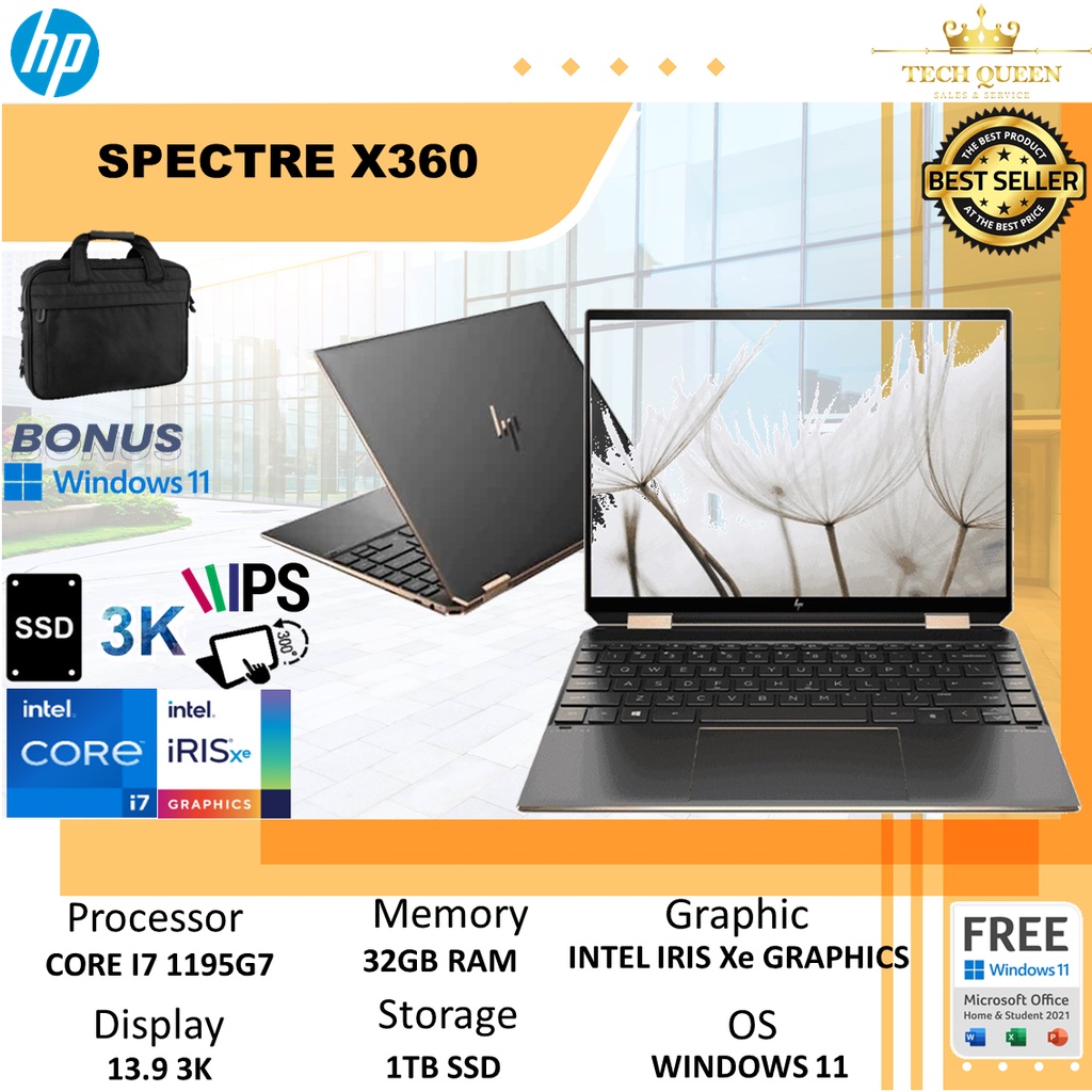 - PROCESSOR : Intel® Core™ i7-1195G7 (up to 5.0 GHz with Intel® Turbo Boost Technology, 12 MB L3 cache, 4 cores, 8 threads) - RAM : 32 GB LPDDR4x-4266 MHz RAM (onboard) - STORAGE : 1 TB PCIe® NVMe™ TLC M.2 SSD - VGA/GRAFIS : Intel® Iris® Xᵉ Graphics - DISPLAY/LAYAR : 34.3 cm (13.5″) diagonal, 3K2K (3000 x 2000), OLED, multitouch-enabled, UWVA, edge-to-edge glass, micro-edge, anti-reflection Corning® Gorilla® Glass NBT™, 400 nits, 100% DCI-P3 - Network : Intel® Wi-Fi 6 AX201 (2×2) and Bluetooth® 5 combo (Supporting Gigabit data rate) - Camera : HP True Vision 720p HD IR camera with camera shutter and integrated dual array digital microphones - Baterai : Battery : 4-cell, 66 Wh Li-ion polymer - Keyboard : Full-size, backlit, nightfall black keyboard, Finger Print Reader