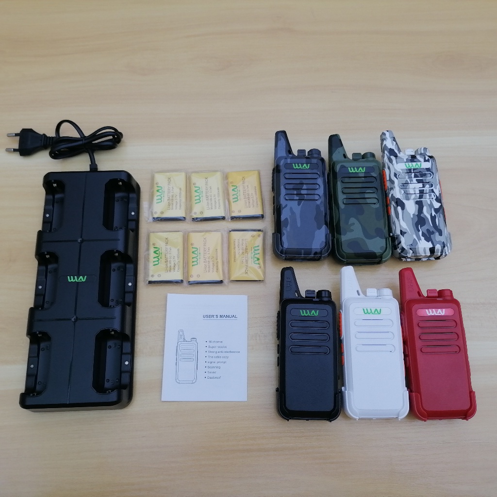 Handy Talky WLN HT C1 UHF TWO WAY RADIO 1 Kotak Isi 6 Set walkie talkie WLN two way radio ini didesain menarik dengan ukuran perfect portable size, sangat ringan dan tipis sehingga mudah untuk dibawa kemanapun. Walkie Talkie / HT ini memiliki 16 Channel UHF 400 - 470MHz untuk berkomunikasi antar walkie talkie. Tak hanya itu, Walkie talkie memiliki berbagai fitur seperti MIC/ Speaker port, USB plug, Channel selector. Untuk Baterai menggunakan baterai Li-ion dengan kapasitas 1000mAh. Salah satu keunggulan dari WLN adalah suara yang di hasilkan sangat jelas dan jangkauan pancar yang cukup jauh (up to 1-5KM tergantung kondisi lapangan). Cocok digunakan oleh pekerja proyek, pertambangan, pembangunan gedung, security, hingga kilang minyak di lepas pantai.