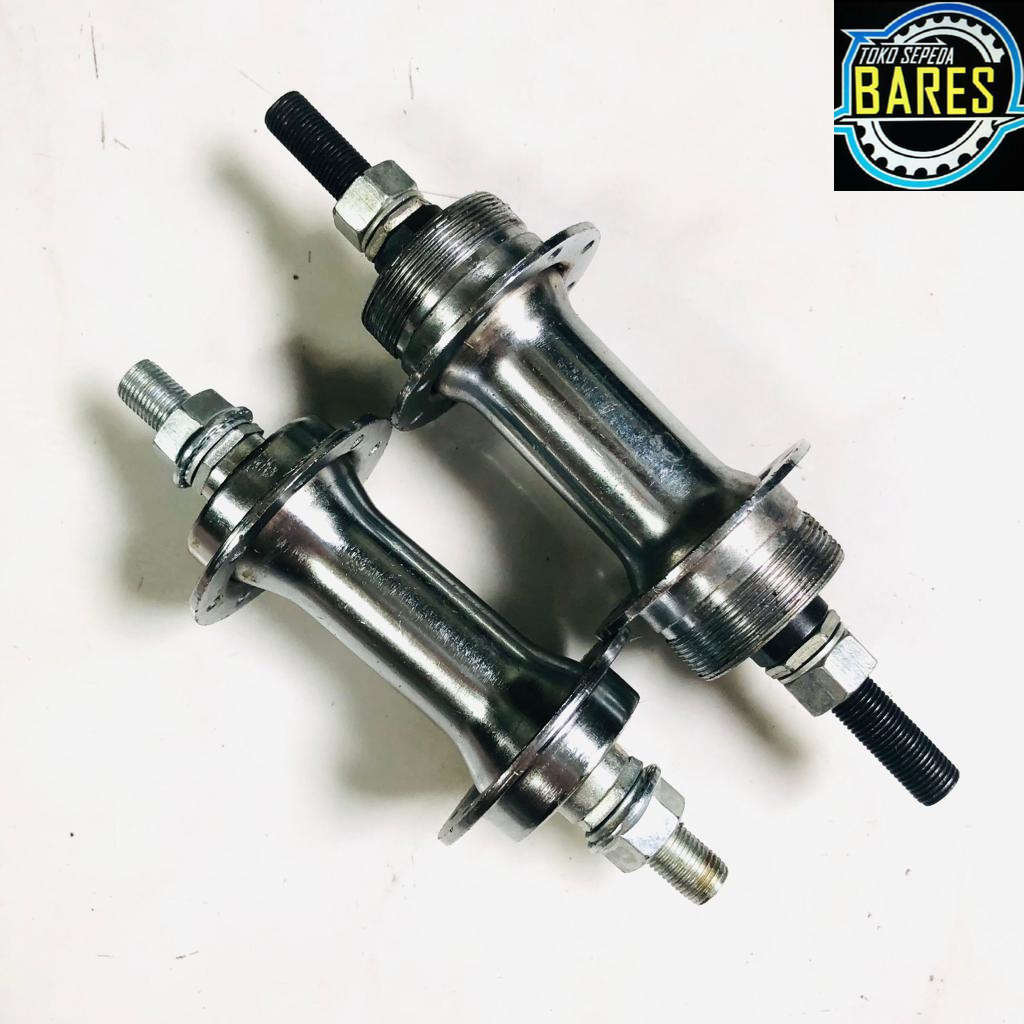 Hub Depan / Belakang Sepeda Frontis Lubang 16 Double Drat / Bos Pelor Drat Ulir India - Merk: Frontis - Model: Drat/ulir - Warna: Chrome - 16 hole / lubang - Tanpa Quick Release - Varian: Muka/Depan (Pendek) dan Belakang Double Drat (Panjang) - DEPAN panjang +/- 140 mm - BELAKANG panjang +/- 180 mm - Depan untuk sepeda single speed, seperti BMX dan Mini dengan semua jenis rem kecuali rem cakram / mechanical disc brake - Belakang untuk sepeda single speed, seperti BMX dan Mini dengan semua jenis rem - Biasanya untuk sepeda ukuran 12 - Harga untuk 1 pc (buah) saja, sepasang= beli 2
