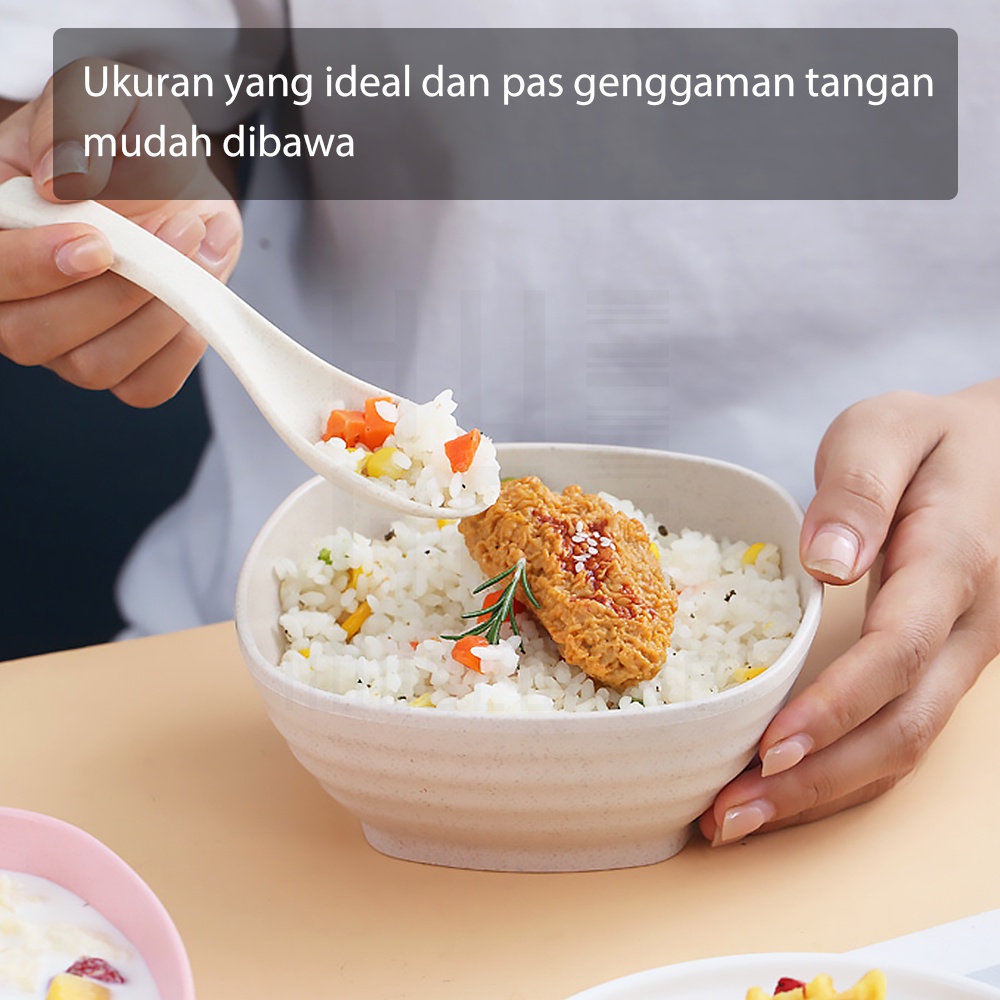 Spesifikasi produk: * Nama Produk : Peralatan Makan Wheat Straw * Bahan Produk : Wheat Straw (Serat Gandum) + Plastik PP Food Grade * Warna Produk : Cream, Pink, Biru, Hijau * Varian dan Ukuran Produk : - Mangkuk Bulat 11,5 cm : 11,5 x 11,5 x 5,9 cm - Mangkuk Bulat 13,5 cm : 13,5 x 13,5 x 6 cm - Mangkuk Bulat 15 cm : 15 x 15 x 7 cm - Mangkuk Segi 15 cm : 15 x 15 x 5,5 cm - Mangkuk Bulat 17 cm : 17 x 17 x 9 cm - Piring Bulat 20 cm : 20 x 20 x 3 cm - Piring Bulat 23 cm : 23 x 23 x 3 cm - Piring Bulat 25 cm : 25 x 25 x 3,5 cm - Piring Segi 14,5 cm : 14,5 x 14,5 x 1,5 cm - Piring Bulat Dalam 14,5 cm : 14,5 x 14,5 x 3 cm - Piring Segi Dalam 14,5 cm : 14,5 x 14,5 x 3 cm - Piring Persegi Panjang 17 cm : 17 x 12 x 1,5 cm - Cangkir 7,5 cm : 7,5 x 7,5 x 10 cm - Set Alat Makan (Sendok, Garpu, Sumpit) + Box - Set Alat Makan (Sendok, Garpu, Sumpit) Tanpa Box - Sendok Makan Kecil