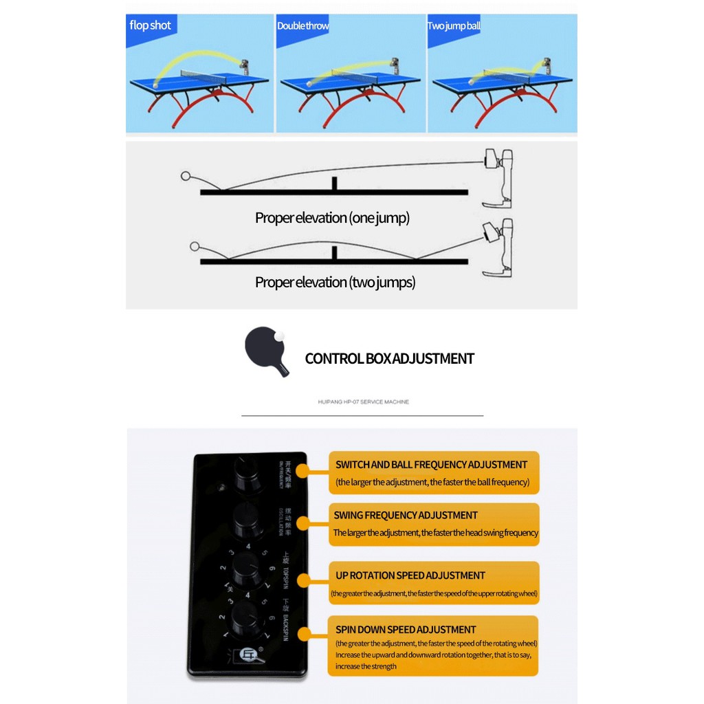 Specification Brand: Huipang Product Model: HP-07 Assemble Location: Clip On Table Spin: Over Spin, Left Top Spin, Right Top Spin, Hook Spin, Slice Spin, Left Under Spin, Right Under Spin, Back Spin Arc Adjust: 7-angle settings Serving Frequency: 40-70/min Suitable For Balls: 40+ Serving Speed: 4-40m/s Point of Fall: Random Capacity: Up to 120 balls One-Button Unloading Balls: Yes Rated Voltage: 100-240V Rated Power: 36W Rated Frequency: 50/60Hz Gross Weight: 4.5 Kg Nett Weight: 3.5 Kg
