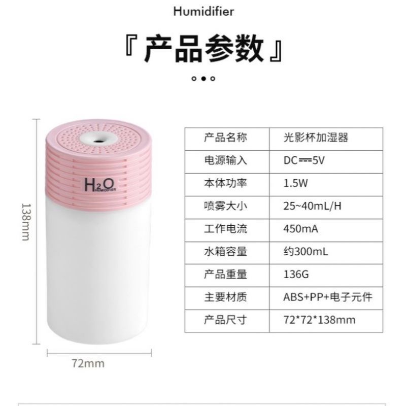 SPEK: Power (Input/Output) => DC 5V 450mA 25-40mL/H Daya Listrik => 1.5 Watt Kapasitas Tangki => 301 ml Lampu LED Bahan => Plastik ABS