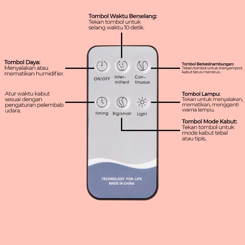 Remote Control Remote control memudahkan Anda dalam mengatur fungsi dari humidifier ini dari jarak jauh, seperti mengatur tingkat kelembaban dan juga nyala lampu led.