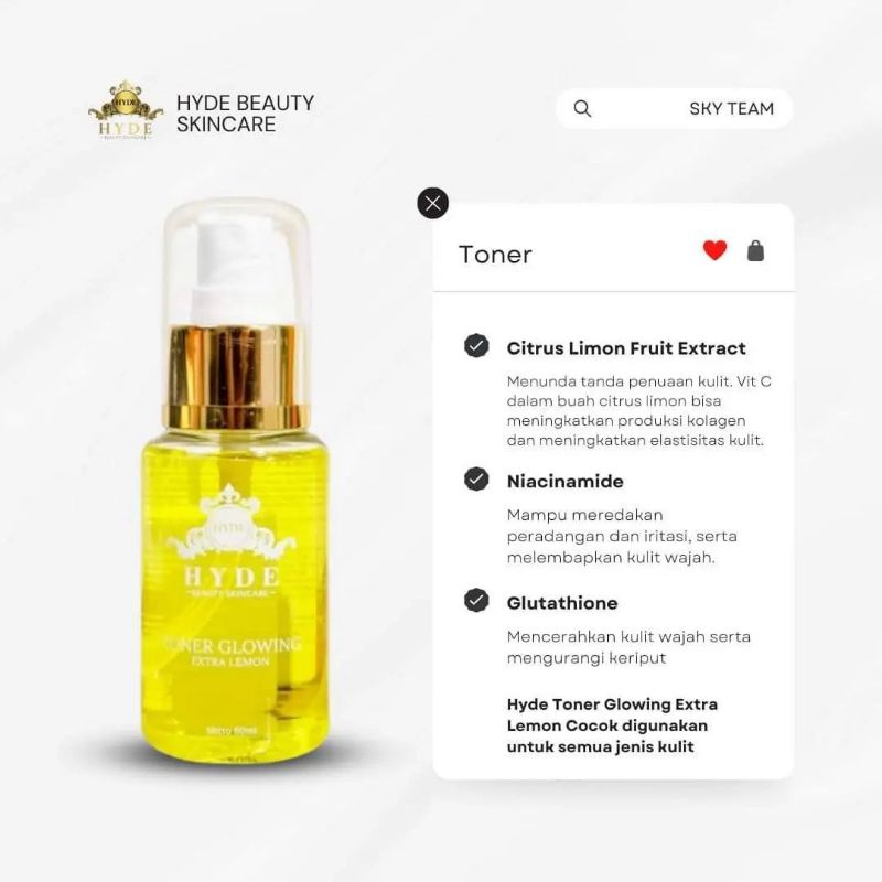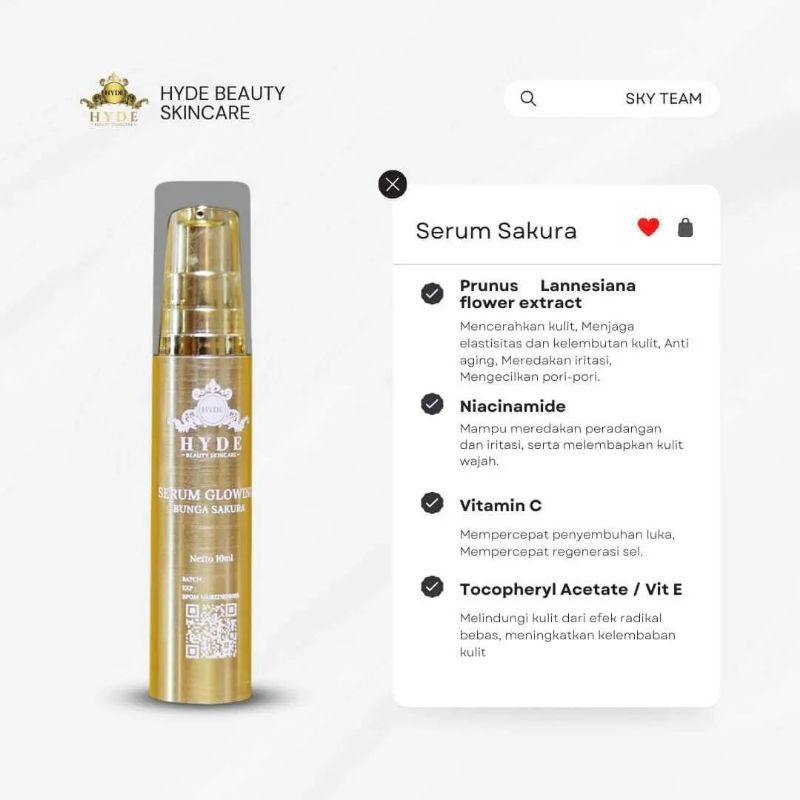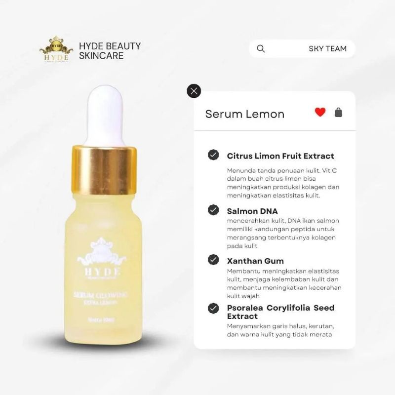 Di hyde skincare kita menawarkan 2 varian serum dengan kandungan dan manfaat terbaik . 1. SERUM GLOWING EKSTRA LEMON PLUS DNA SALMON Serum dengan kandungan ekstra lemon dan Dna salmon yang manfaat keduanya sudah tidak perlu diragukan lagi , bikin wajah auto glowing dan kenyal . Sangat cocok untuk yang memiliki beruntus dan jerawat . 2. SERUM GLOWING EKSTRA BUNGA SAKURA Serum dengan kandungan ekstra bunga sakura yang sangat terbukti mampu mengatasi segala jenis keluhan di wajah