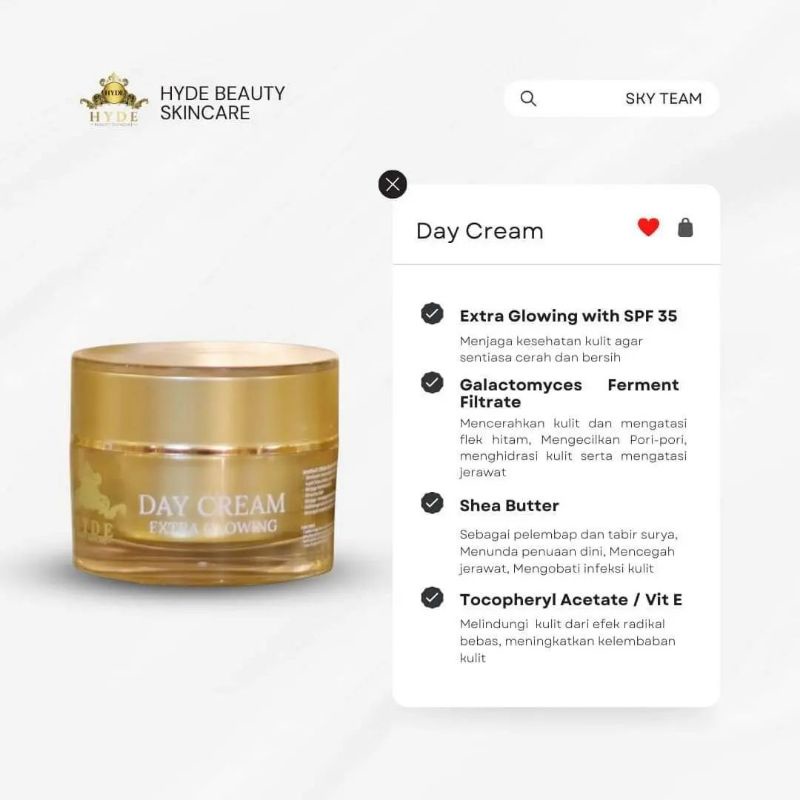 Cream siang Hyde Beauty Skincare aku ciptakan sesuai dengan banyaknya kebutuhan konsumen . Dengan kandungan Spf 35 yang mampu menjaga kulit dari sinar buruk matahari . Dengan tekstur yang lembut dan ringan sangat memudahkan untuk di aplikasikan ke wajah .