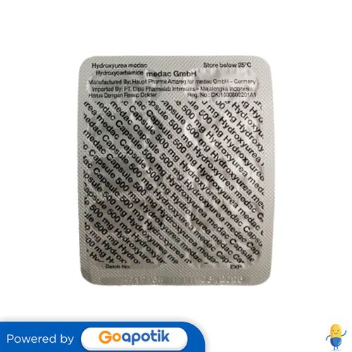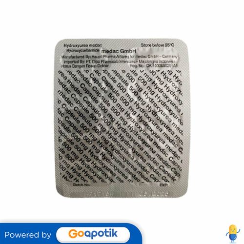 Deskripsi : PENGGUNAAN OBAT INI HARUS SESUAI PETUNJUK DOKTER. Hydroxyurea digunakan untuk mengobati leukemia mieloid kronik, trombositemia esensial, dan polisitemia vera. | Komposisi : Tiap kapsul mengandung Hydroxycarbamide 500 mg | Dosis : ATURAN PAKAI HARUS SESUAI DENGAN PETUNJUK DOKTER. Leukemia mieloid kronik Awal 40 mg/kg BB/hr, tergantung pd jumlah sel darah putih. Pasien dg sel darah putih <20 x 109/L menjadi 20 mg/kg BB/hr. Trombositemia esensial Awal 15 mg/kg BB/hr. Polisitemia vera Awal 15-20 mg/kg BB/hr. | Indikasi : Untuk mengatasi Leukemia mieloid kronik fase kronik atau akselerasi; trombositemia esensial atau polisitemia vera pd risiko tinggi utk terjadinya komplikasi tromboemboli. | Perhatian Khusus : Gangguan ginjal dan hati. Lakukan pemeriksaan sel darah lengkap secara berkala. | Kemasan : blister @ 10 kapsul | NIE : DKI1030600201A1