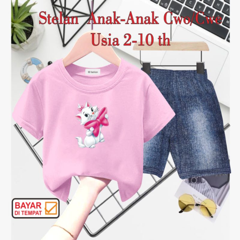 Detail ((IB))SETELAN ANAK PEREMPUAN SEMI JEANS/KUCING MARIE DIGITAL SABLON
