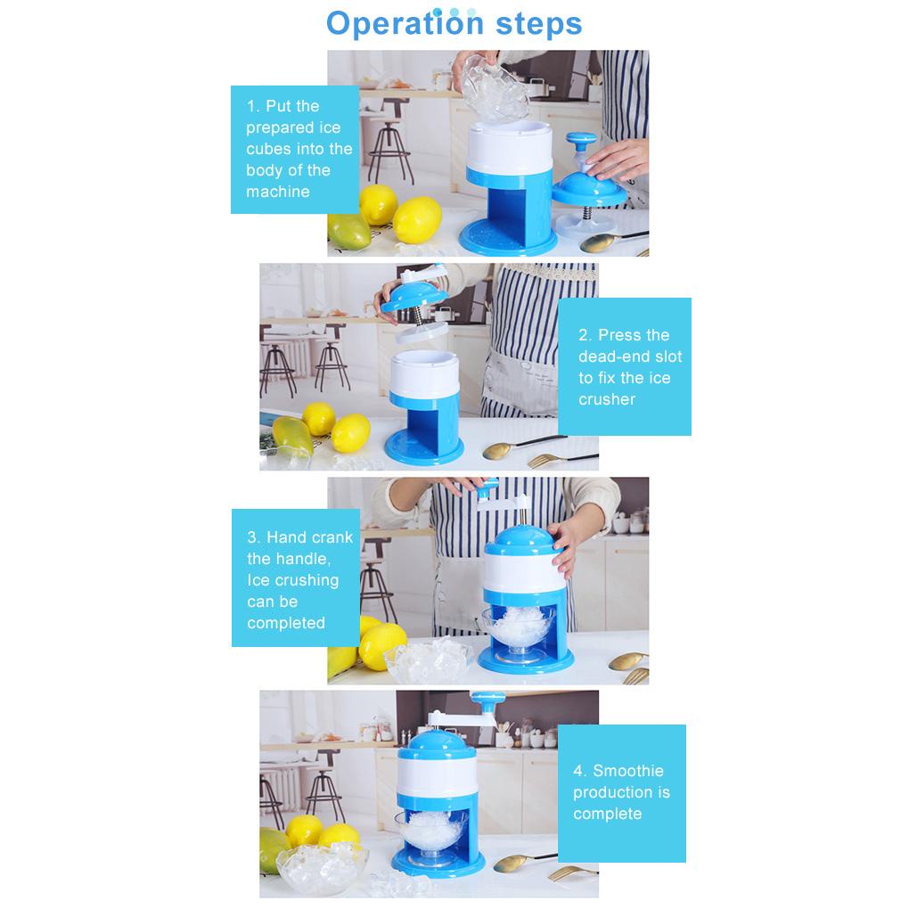 Pengoperasian mudah: Anda hanya perlu menambahkan es batu ke penggiling dan menutup tutupnya, memutar engkol untuk membuat kerucut salju.