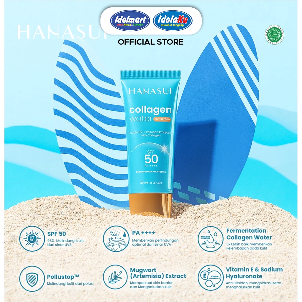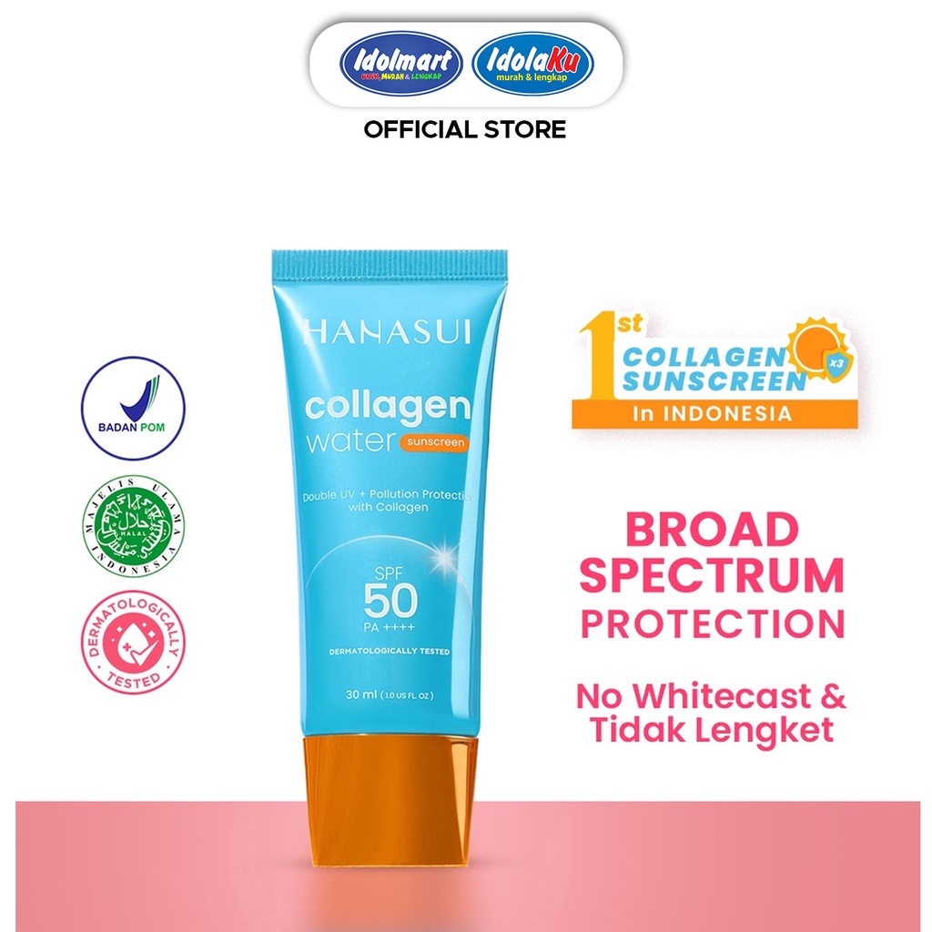 Hanasui Collagen Water Sunscreen memiliki Strong Ingredients yaitu : SPF 50 PA +++ Broad spectrum Protection lebih optimal menjaga kulit dari sinar uv