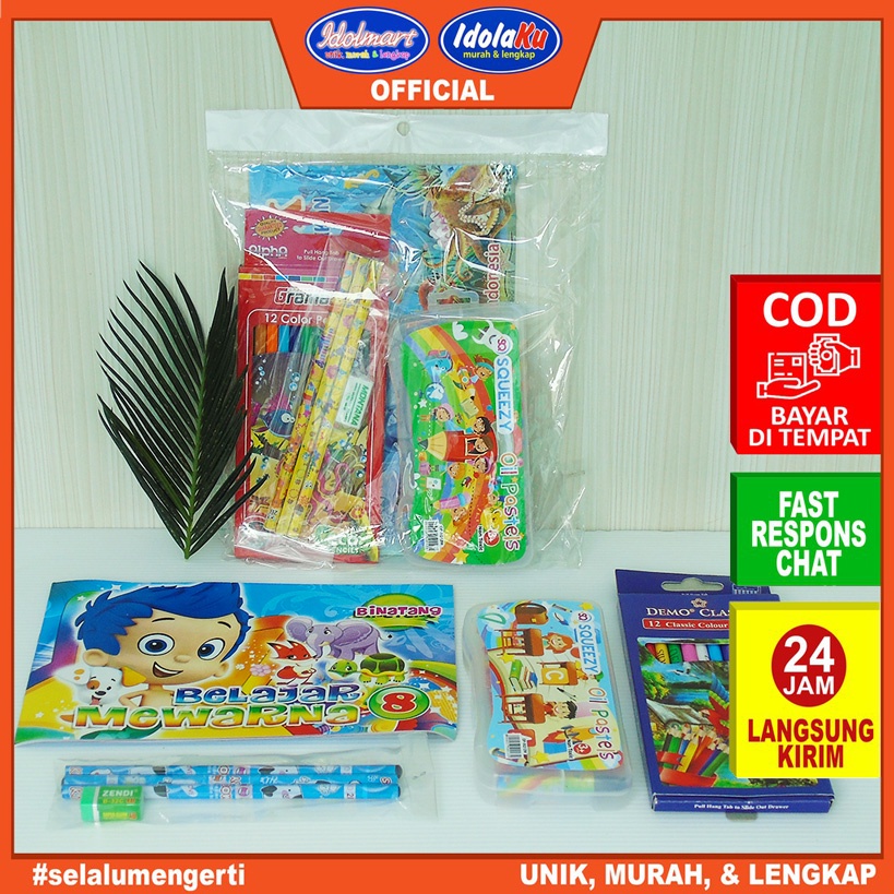 Detail : - 3 buah pensil tuli - 1 buah penghapus - 12 warna pensil warna classic color - 12 warna crayon - 1 buku mewarnai