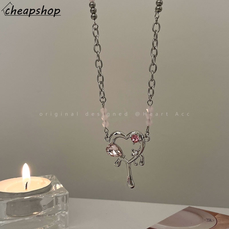Nama: Kalung Kristal Merah Muda Kalung Hati Perak Rantai Choker untuk Aksesoris Perhiasan Wanita