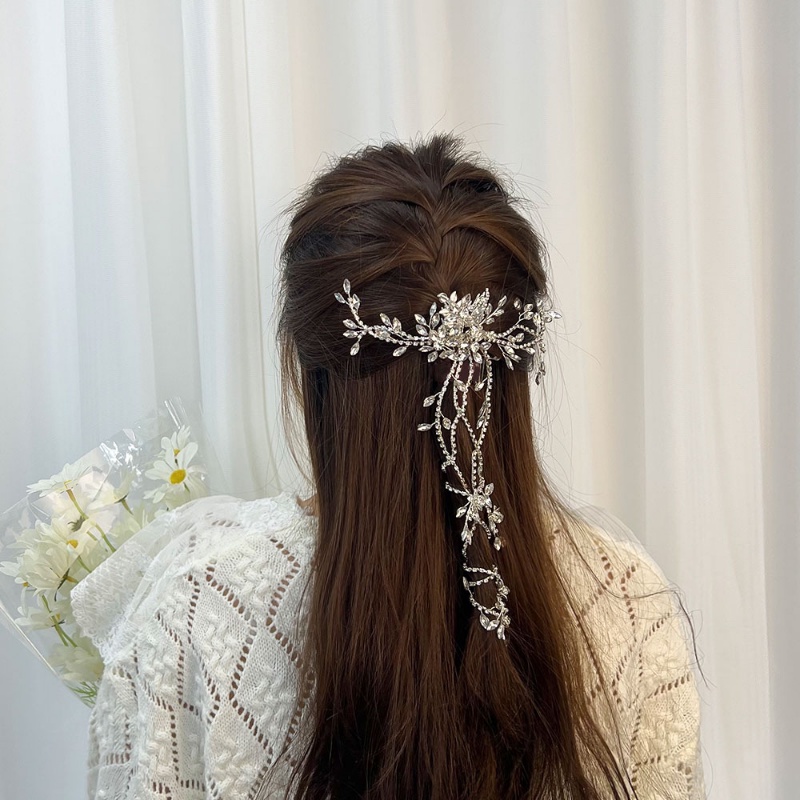 Detail Ikat Rambut Kristal Bunga Elegan/Bridal Rantai Rumbai Panjang Berlian Imitasi Sisir Rambut/Wanita Pesta Perjamuan Braided Hiasan Kepala