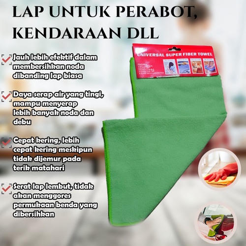 ukuran : 30cm x 30cm bahan : kain microfiber lap serbaguna multifungsi cocok untuk membersihkan segala jenis benda di ruangan anda dan bahan cepat kering. bahan sangat menyerap.
