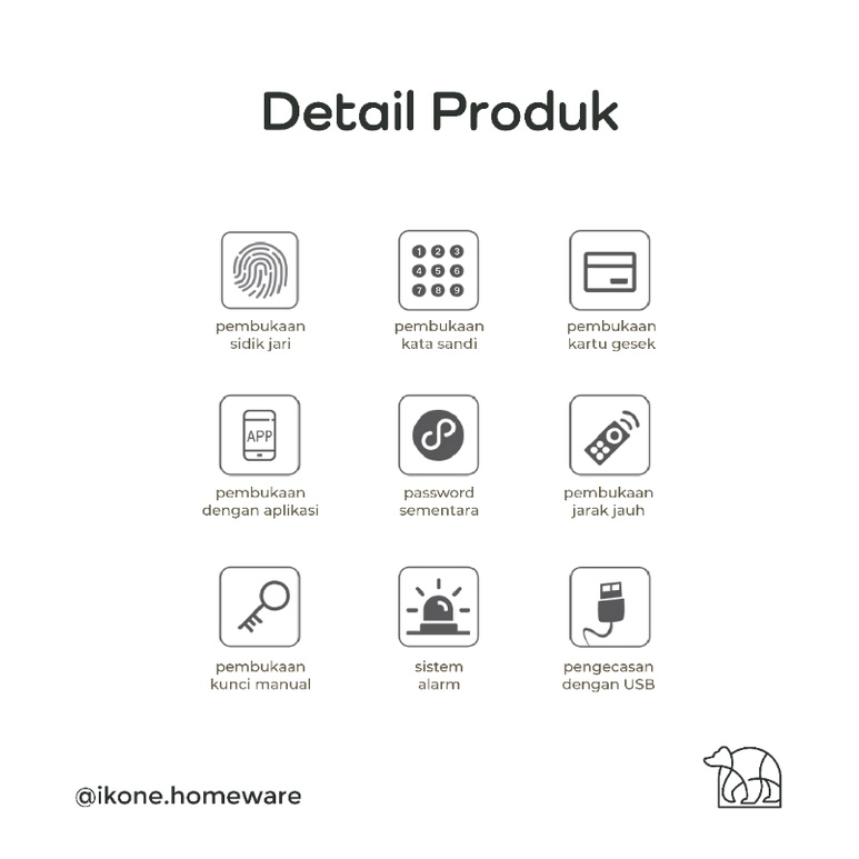 Feature : - FAST RESPONSE FINGERPRINT. Sensor fingerprint yang dapat merespon kurang dari setengah detik - BATERAI TAHAN LAMA. Diperkirakan dapat bertahan hingga 1 tahun dengan penggunaan 10x sehari - BUAT PASSWORD SEMENTARA. Buat hingga puluhan password yang berlaku sementara melalui mobile app - ANTI SPY PASSWORD. Masukan password palsu hingga 24 digit dan kombinasikan dengan password sesungguhnya - Support long distance remote control via APP, like Open the door remotely, share temporary password and dynamic password, and RFID cards manage. - Low Battery Alarm function:When the battery is running out, it will automatically issue "didi"prompt tone. - Equipped with USB emergency charging port. - Cocok untuk ketebalan pintu 30-100mm door.