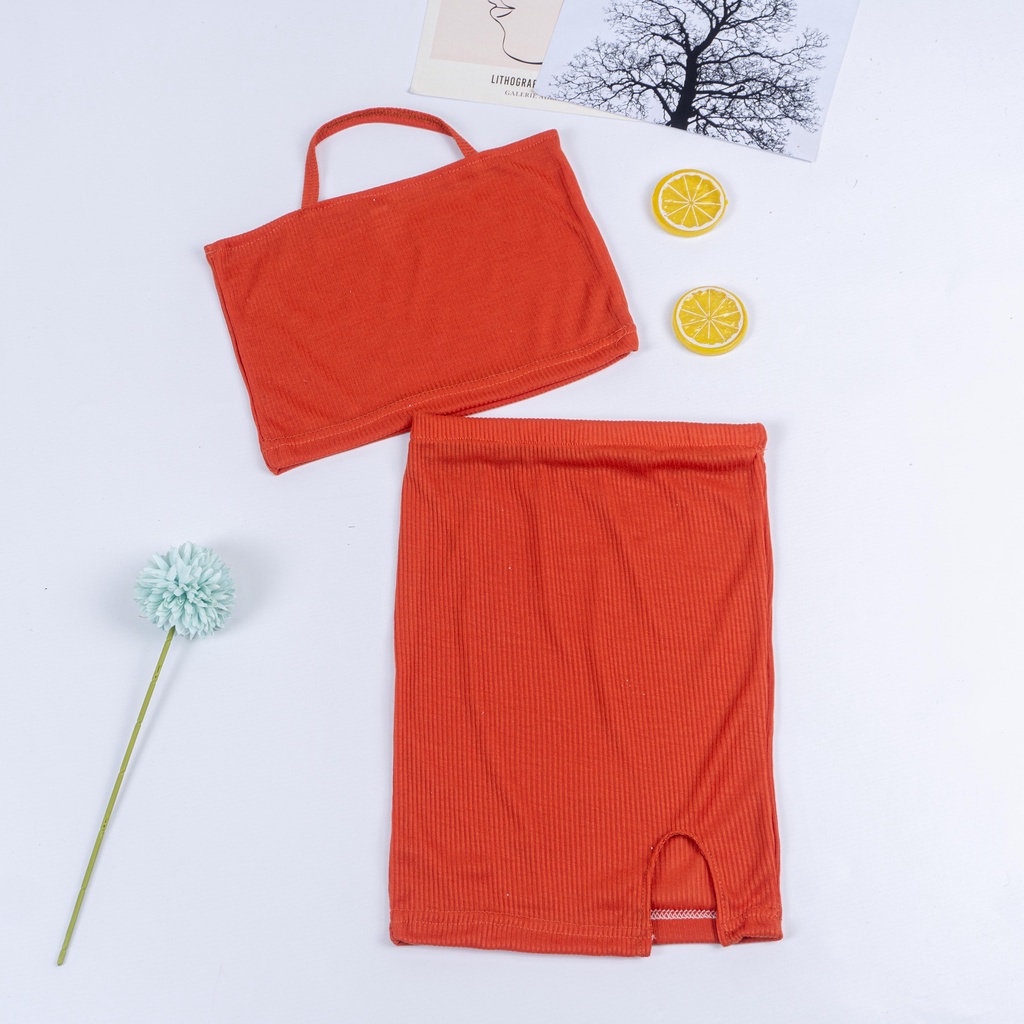 Detail IL - SET HALTER ANAK PEREMPUAN / SETELAN RIB HALTER TOP & SPLIT HEM SKIRT
