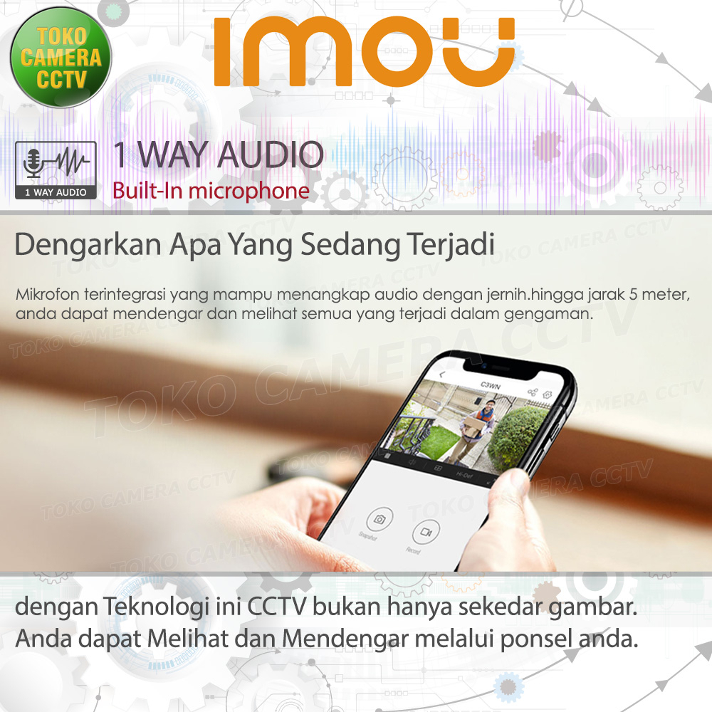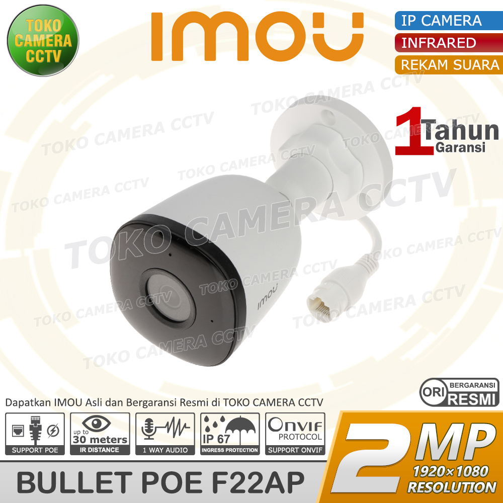KEUNGGULAN dan FITUR : -Support POE,1 kabel untuk data dan daya listrik. -Resolusi 2MP (1920 x 1080) tampilan luas WIDE angle. -Digital Zoom hingga 8x perbesaran gambar. -Dilengkapi dengan Build-in MIC,dapat merekam suara. -InfraRed,tetap dapat menangkap gambar walaupun dalam gelap hingga 30 meter. -IP 67 Kamera Ini tahan seburan air dan debu. -H.256 Kompresi file lebih kecil,tapi kualitas tetap baik,sehingga memory bisa menyimpan hasil rekaman lebih lama. -Motion Detection,mengawasi setiap pergerakan yang ada. -Push Notification,mengirimkan pesan ke HP atau email jika ada penyusup. -Online dimanapun kapanpun menggunakan aplikasi IMOU gratis selamanya. -Live View,Control,dan playback melalui Smartphone Android dan IOS -Support ONVIF,bisa di pasangkan dengan NVR. -Instalasi dan Setting yang mudah. -Klaim Garansi bisa di TOKO CAMERA CCTV. -Bergaransi Resmi IMOU INDONESIA 1 Tahun.