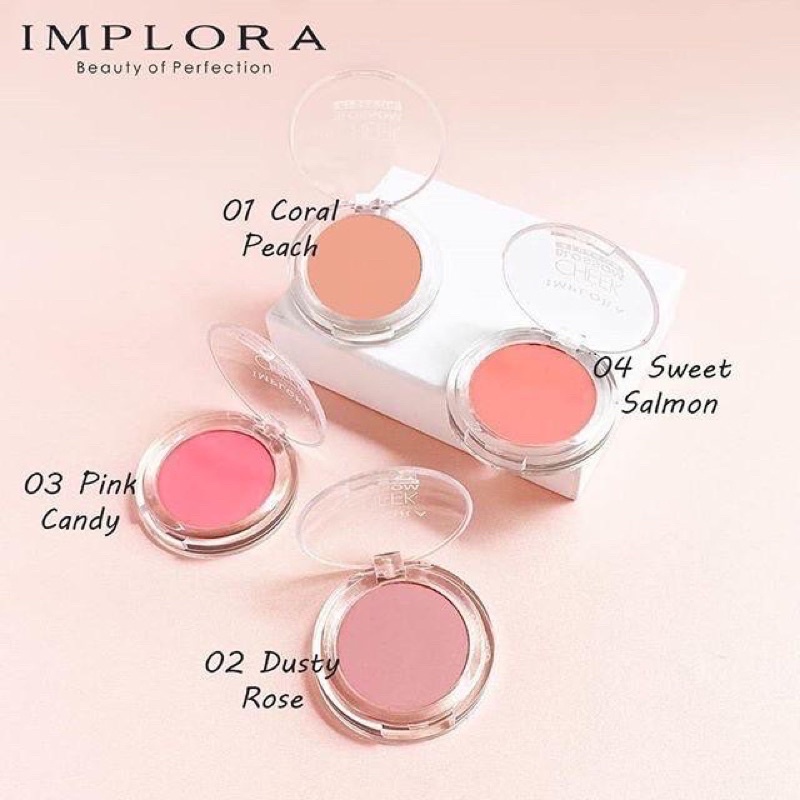 IMPLORA Cheek Blossom Blush On, Tersedia dalam 4 varian : 01 - Coral Peach 02 - Dusty Rose 03 - Pink Candy 04 - Sweet Salmon