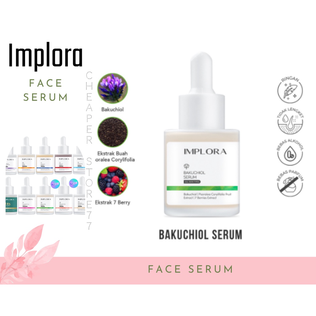 β Ukuran 20ML β 100% BPOM ORIGINAL π»π»π»Tersedia 10 varian : β β ACNE SERUM membantu untuk meminimalkan munculnya jerawat, menyamarkan pori-pori wajah, mengurangi ruam, serta membantu memperbaiki kulit rusak akibat jerawat dengan penggunaan secara teratur. β β LUMINOUS BRIGHTENING SERUM Mengandung Niacinamide 10% dan Kakadu Plum yang kandungan vitamin C nya 70 kali lebih banyak dari buah jeruk, yang dapat membantu mencerahkan, melembabkan, menyamarkan noda hitam serta menutrisi kulit. Dapatkan tampilan kulit yang sehat dan bersinar dengan menggunakan secara rutin. - Direkomendasikan untuk semua jenis kulit - Penggunaan pagi dan malam hari - Mengandung : Niacinamide 10%, Caviar Collagen, Black pearl, Vitamin C β β MIDNIGHT SERUM Mengurangi beberapa tanda penuaan diri pada wajah. Membantu menutrisi kulit, melembabkan serta menyamarkan noda hitam di wajah. Maksimalkan tampilan kulit yang terlihat lebih cerah, sehat dan kencang dengan penggunaan secara teratur. β β PEELING SERUM Implora Peeling Serum membantu mengangkat sel kulit mati serta kotoran pada wajah yang menyebabkan munculnya komedo dan jerawat serta dapat menutrisi, melembabkan dan mencerahkan kulit wajah. Untuk hasil maksimal, gunakan 2 kali dalam seminggu. - Direkomendasikan untuk semua jenis kulit - Penggunaan malam hari - Mengandung : AHA 3%, BHA 2%, PHA 3%, Licorice Extract, Aloe Vera Extract β β HYDRATING SERUM Implora Hydrating Serum membantu proses regenerasi kulit, miningkatkan fungsi skin barrier, dan mencegah tanda-tanda penuaan. Gunakan secara teratur - Direkomendasikan untuk semua jenis kulit - Penggunaan pagi dan malam hari - Mengandung: Hyaluronic Acid, Aloe Vera Extract, Chenopodium Quinoa Seed Extract β β 24K GOLD SERUM Implora 24K Gold Serum membantu mencerahkan, menutrisi dan meningkatkan elastisitas kulit wajah. β β 1% LIPORETINOL SERUM membantu menyamarkan tanda penuaan, mencerahkkan serta membantu meningkatkan sintetis kolagen sehingga kulit wajah tampak lebih kenyal dan sehat alami. β β BAKUCHIOL SERUM kandungan bakuchiol yang dapat membantu meningkatkan elastisitas kulit wajah dan 7 berries yang kaya akan antioksidan sehingga membuat kulit wajah tampak halus merata dan glowing. -Gunakan sunscreen setelah pemakaian serum di pagi hari - Direkomendasikan untuk kulit semua jenis kulit - Penggunaan pada pagi dan malam hari - Mengandung : Bakuchiol, 7 Berries, Salicyic Acid β β SALMON DNA SERUM mempertahankan kelembaban dan elastisitas kulit wajah serta membantu menjaga kulit wajah dari efek buruk.Implora Salmon DNA Serum mempertahankan kelembaban dan elastisitas kulit wajah serta membantu menjaga kulit wajah dari efek buruk polusi, radiasi elektrik dan sinar UV. - Direkomendasikan untuk semua jenis kulit - Penggunaan pada pagi dan malam hari - Mengandung : Sodium DNA, Marine Collagen, Glycogen Ecklonia Cava